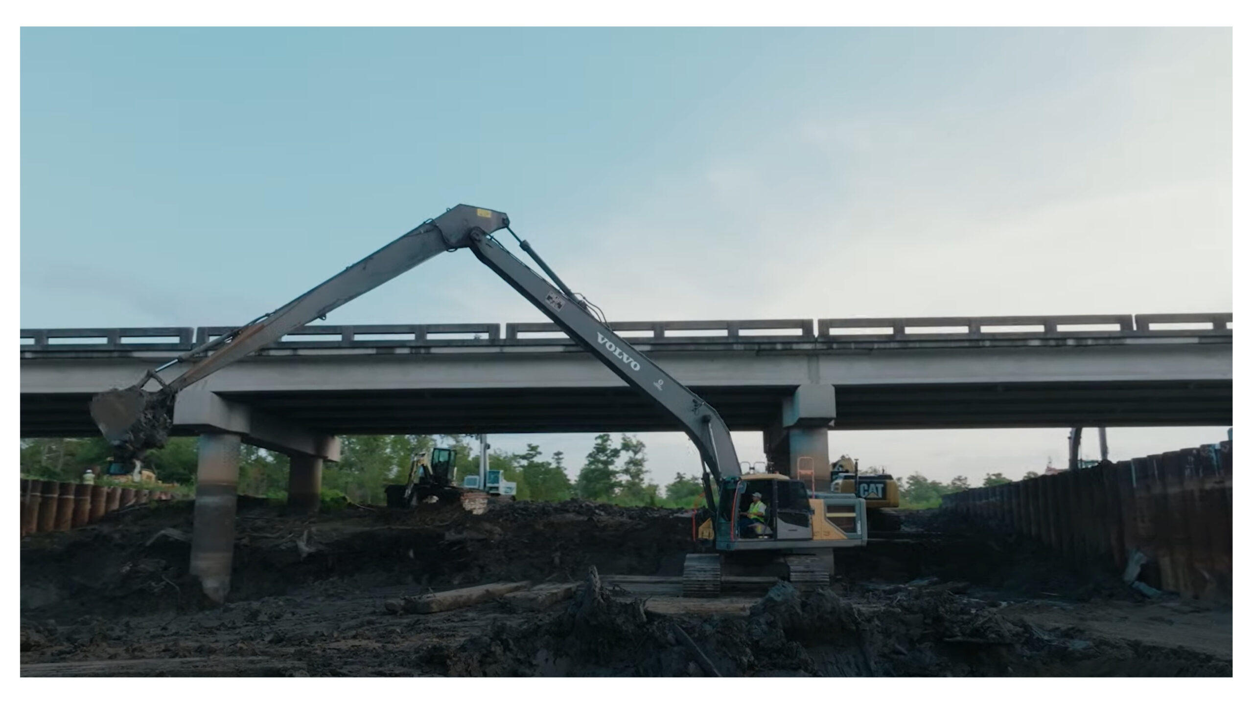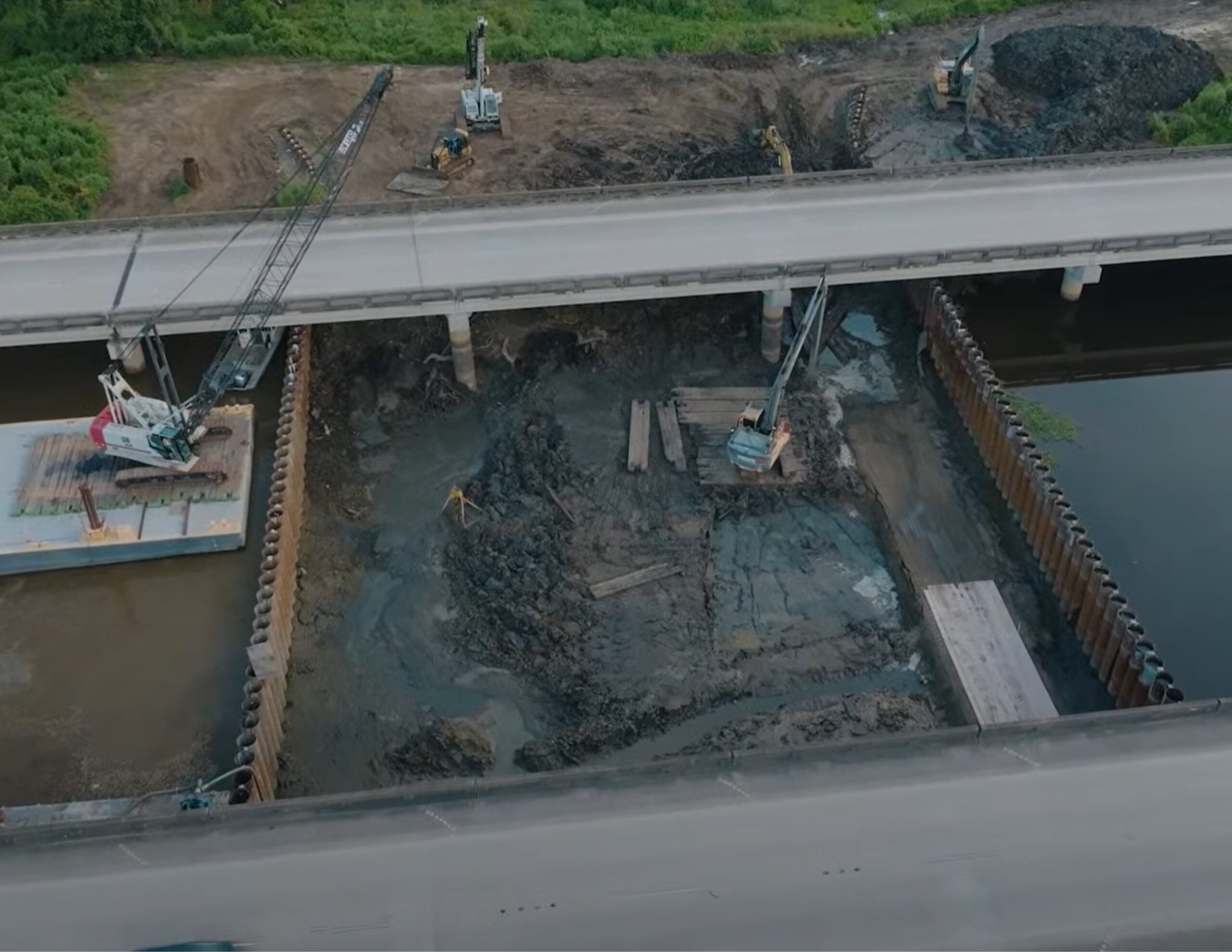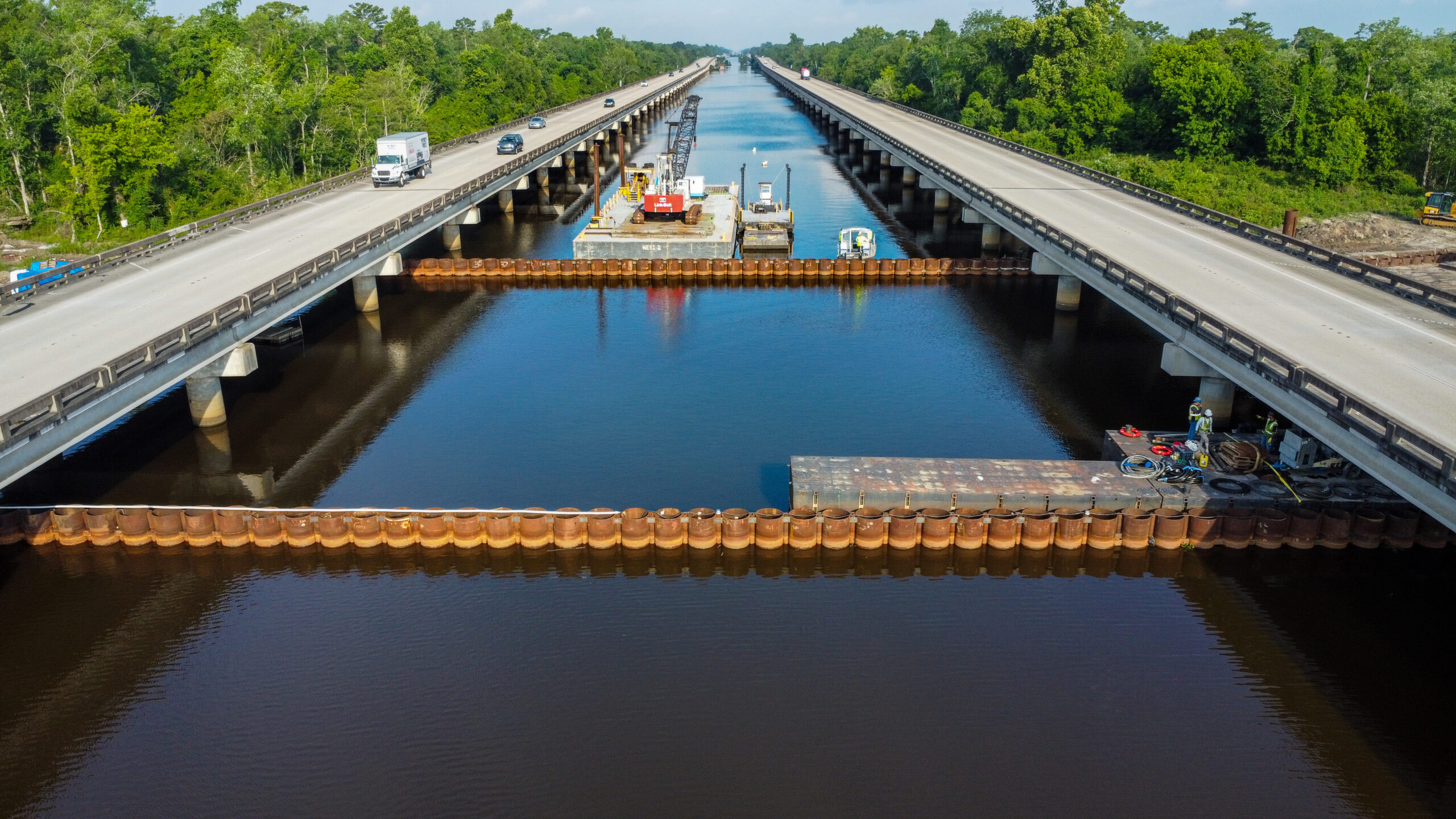 This phase of the project, Reach 106, showcases Dynamic’s expertise in pile driving and levee construction adjacent to active infrastructure, as well as our ability to perform complex marine and heavy civil construction in constrained, high-traffic zones. Dynamic has coordinated closely with the Louisiana Department of Transportation and Development (LADOTD) to minimize disruption along Interstate 10, one of the state’s busiest corridors.